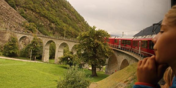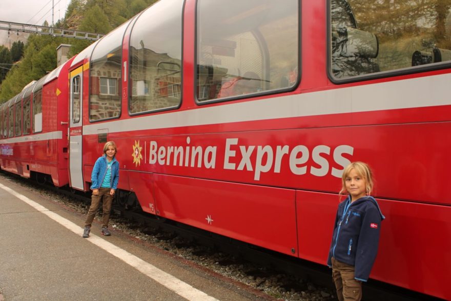 Ze Scuolu jede červený vláček Rhétských drah stále podél řeky Inn až ke Svatému Mořici. Rhétská dráha obsluhuje 384 kilometrů převážně horských úzkokolejek v největším švýcarském kantonu Graubünden. Z toho bezmála třetina je pod památkovou ochranou UNESCO. Kousek před Pontresinou se připojuje trať Albula, kterou projíždí kromě klasických vlaků také speciální panoramatické soupravy Bernina Express (celou trasu z Churu do Tirana urazí za 4 hodiny a na jakýkoli úsek je potřeba mít předem koupenou rezervaci). Střecha vagónů je z velké části prosklená, a tak nemusíte kroutit hlavou, abyste viděli vysoké hory a modré nebe. Přestupujeme na zmíněný Bernina Express a čeká nás scénicky ten nejhezčí úsek.