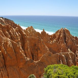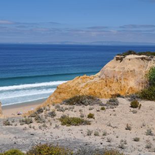 Potmě stavíme stan a naše nálada se ještě zhoršuje, protože kemp je dost plný. Jenže za denního světla chápeme všechno trochu lépe. Kemp je ve skutečnosti obrovský, ale autem se dál nesmí. Vzdálenější části jsou opuštěné a sahají až nad pobřeží. Můžete si tu tedy postavit stan s výhledem na moře, a to výhledem ne jen tak ledajakým. Od bílé pláže a azurového moře vás dělí dech beroucí písečné útesy, a tam dole na vás čeká uvolněná atmosféra tolik vzdálená turistickým letoviskům.