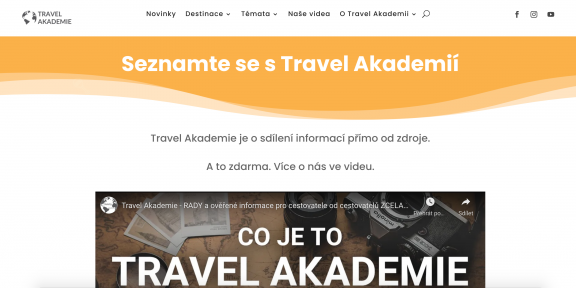 Snad každý z nás někdy plánoval nebo bude plánovat vycestovat i za hranice ČR. Ať už v rámci Evropy nebo do exotických destinací. A je jedno, zda jsme mladý a nezávislý dobrodruh, milovník relaxu na pláži, rodina s dětmi nebo zralý ročník, který má strach, že se nedomluví. Otázkou je, kde v rámci takového plánování vlastně začít. Kam vůbec vyrazit a kdy. Jak na letenky, jak se dopravovat na místě, kde bydlet, jaká mít či nemít očekávání, co tam vidět, jak nenaletět. Jaké speciality ochutnat, na jaké kulturní šoky se připravit. Smyslem Travel Akademie je poskytnout více i méně zkušeným cestovatelům praktické informace k destinacím, video návody i nápady na cestovní itineráře. Součástí online platformy jsou fotoreportáže, zápisky z cest, zábavné, zákulisní i bizarní články ze života na cestách. Jasné a aktuální rady od ověřených zdrojů a lidí, kteří v destinaci celoročně žijí. Vše je zdarma, v češtině, na jednom místě a je k dispozici všem a kdykoliv. V neposlední řadě chceme také vytvářet cestovatelskou komunitu, propojovat lidi, inspirovat se vzájemně.