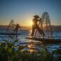 Hladinu jezera, za nímž z mlhy vystupují vysoké hory, zarůstá spleť vodních hyacintů a plovoucích zahrad, mezi nimiž vykukují vesnice na kůlech, rybáři veslující jednou nohou i buddhistické chrámy a kláštery.