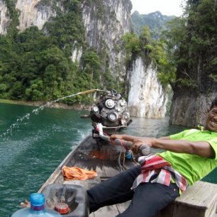 Na břehu jen chvilku přemýšlíme, jak se dostaneme do Ban Ta Khuan na hlavní silnici. Ale jen chvilku – sympatická skupinka „našich“ sportovních rybářů nám hned se samozřejmostí nabízí odvoz jejich pronajatým luxusním vanem. To si tedy necháme líbit! A tak naše dobrodružství pokračuje. A kam? No jasně, do džungle v druhé části národního parku Khao Sok.