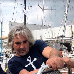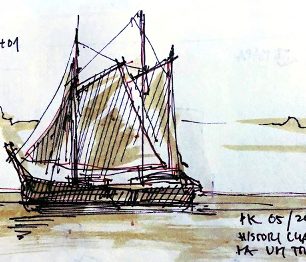„Zase jsem neměl barvy. Téměř vždy je při balení zapomenu na pracovním stole. Tak jsem jako již mnohokrát maloval tou studenou kávou a kreslil fixem. Obojí mám často na lodi po ruce. Fixu používám k zápisům v lodním deníku a kávu… však to znáte. Kreslit se hodilo, poslední zápis fixem v deníku byl: 1000 (UTC+01) moře je klidné, žádné meteorologické varování. Že jsem bez barev a skicáku, tak na to jsem si již zvykl.“