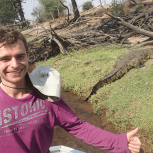 Po týdnu brzkého vstávání jsme se s rodiči probudili již ve tři čtvrtě na čtyři i bez budíku. Já si jako každé ráno zacvičil a dnes jsem i tátu inspiroval natolik, že se trošku vyklusával a dal si dokonce i několik dřepů. Ve čtvrt na šest už na nás čekal taxík a v půl šesté už jsme vyplouvali na řeku. Ranní atmosféra byla daleko klidnější než odpolední. Pozorovali jsme vycházející slunce, a i když jsme neviděli tolik zvířat, já si dokázal atmosféru místní přírody daleko lépe vychutnat. Výlet po řece ve mě zanechal pocit klidu a souznění s přírodou. Ranní plavba přinesla i jeden úsměvný moment. Řeka Chobe tvoří přirozenou hranici mezi Botswanou a Namibií. Táta potřeboval nutně na záchod. Loďka zastavila u namibijského břehu a oba rodiče tam vykonali svoji potřebu. Tím tak trošku ilegálně navštívili další stát, z čehož měla radost hlavně máma. Nevšimla si však, že zatímco tam byli na záchodě, pár metrů od nich odpočíval krokodýl. To, že ignorujeme potenciální nebezpečí, máme asi v rodině. Z našeho ubytování jsem si šel zaběhat do lesa. Po nějakém tom kilometru jsem se dostal do lidmi opuštěného lesa. Náhle se přede mnou ozval dusot a přes cestu mi přeběhlo stádo antilop. V tom okamžiku mi došlo, že jestli tam jsou antilopy, může tam zabloudit i lev. Zbystřil jsem všechny smysly. Můj běh pokračoval podél letištního plotu. Bedlivě jsem pozoroval les, zda na mě něco nevyběhne. Bylo by to stejně asi jedno, protože bych lvovi neutekl. Lidé jsou fakt pomalá zvířata. Byl to docela adrenalinový zážitek. Druhý den jsem se chtěl projít po silnici k letišti. Zastavilo mi auto a řidič mi řekl, že chodit po silnici je nebezpečné. Buvoli prý na lidi mohou zaútočit. Nechal jsem se jím tedy svézt a vzpomínal jsem na svůj běh. Když mu přišla nebezpečná silnice, co by asi říkal na běh lesem.