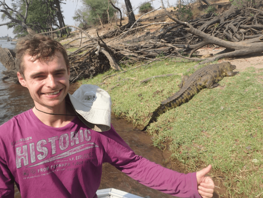 Už při hledání ubytování jsme zjistili, že je zde vše dražší. Za půjčení auta chtěli neuvěřitelné sumy (750 USD na den), takže jsme se raději vydali na vyjížďku lodí po řece Chobe v části, kde protéká národním parkem. Ještě že jsme nejeli autem. Z řeky se nám naskytly neuvěřitelné výhledy na zvířata. Průvodce (další pohodový týpek s dredy) nám kromě spousty zajímavých informací také vysvětlil, že protože je to od roku 1932 oblast národního parku, kde se nestřílí, zvířata člověka nepovažují za hrozbu. Takže jsme se dostali jen několik málo metrů od buvolů, slonů, antilop a rozličných druhů ptáků, aniž by se zvířata lekla a utekla (uletěla). Pro mámu byl neskutečný zážitek, když jsme zastavili jen pár metrů od třímetrových krokodýlů. Průvodce vysvětlil, že krokodýli na lidi v lodi v této oblasti ještě nezaútočili (pokud teda nekoupou ruce či nohy ve vodě). Jediná zvířata, před kterými měl respekt, byli osamocení hroši. Ti jsou prý nebezpeční, protože mají tendenci bojovat o své teritorium. Ale rodinky hrochů považoval za bezpečné. Takže jsme si vychutnali pohled na hrochy jak ve vodě, tak i na souši z malých vzdáleností. Zvířata „skoro na dotek“ nás uchvátila natolik, že jsme se rozhodli si vyjížďku lodí zopakovat i další den ráno.