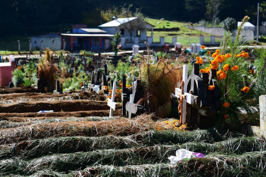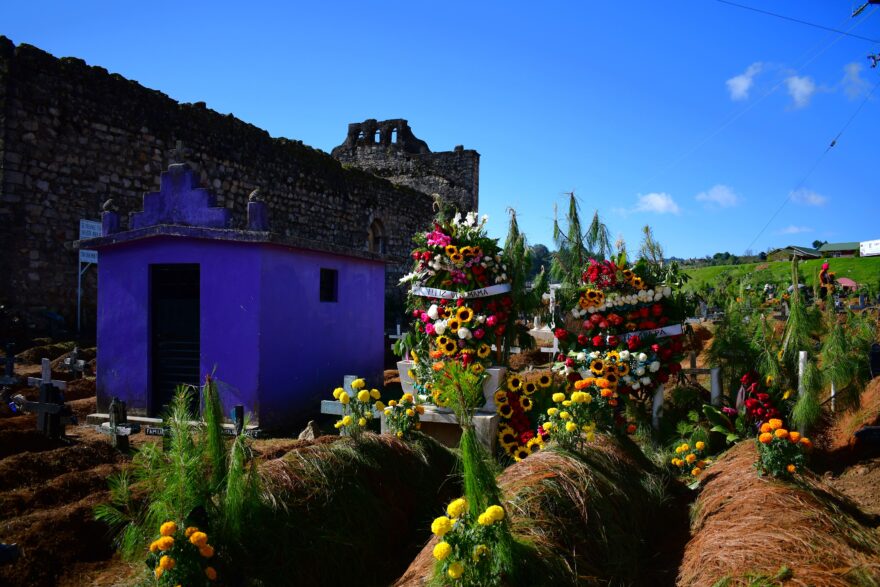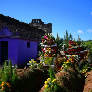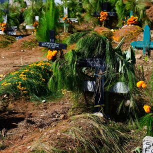 Ještě než se pustíme do rozuzlení našeho kostelního příběhu, je potřeba podotknout, že byť právě za ním sem jezdí cestovatelé z celého světa, není jedinou zajímavostí Chamuly. Na tu první ostatně narazíte hned za uvítací cedulí, když váš mikrobus ze San Cristóbalu zabočí na parkoviště. Právě pod ním se totiž rozkládá chamulský hřbitov, za kterým se tyčí rozpadlý kostel svatého Šebestiána. Ten sami Chamulané nechali tak, jak je – domnívají se totiž, že svatostánek, co nemá schopnost ochránit sebe sama před nepřízní počasí, není dostatečně silným cílem pro místní věřící. Ale zpět k hřbitovu – ten totiž nemá hřbitovní zdi, jak jsme zvyklí, ani pevně ohraničené hroby žulou či jiným materiálem. Mrtvé tu nespalují, ale pohřbívají postaru, dle katolické víry totiž člověk potřebuje i své tělo, aby mohl předstoupit před Poslední soud. A snad proto se v Mexiku říkává, že před návštěvou hřbitova byste se neměli koupat, abyste si nesmyli jakousi ochrannou vrstvu pokožky, jinak by na vás mohl „skočit mrtvý“.