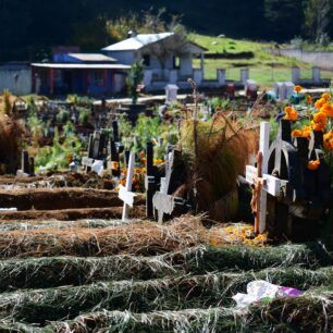 To, co vás na první pohled určitě zaujme, jsou různě barevné kříže na hrobech. U některých hrobů najdete dokonce křížků více pohromadě – to značí i více pohřbených na témže místě. Černé označují hroby zesnulých „starců“, za které obyvatele Chamuly považují muže a ženy starší 52 let, což v našem pojetí stáří nutně vyvolává zdvihnuté obočí. Právě číslo 52 je však velmi zajímavé – Chamulané jsou totiž známí jako dlouhověcí a není výjimkou, že se dožívají klidně i 90 let. Oněch „limitních“ 52 let se tak dá považovat za věk tradičního indiánského cyklu času, ve kterém se setkávají kalendáře, a dá se tak chápat vlastně jako naše jedno století. Modré křížky jsou na hrobech pro dospělé muže a zelené pro mladé dámy, jejichž život se naplnil. A nakonec bílé – ty jsou pro ty nejmenší, zesnulé děti. Na barevném křížku mají všichni bez rozdílu jen rok úmrtí – ten totiž značí počátek nové cesty.