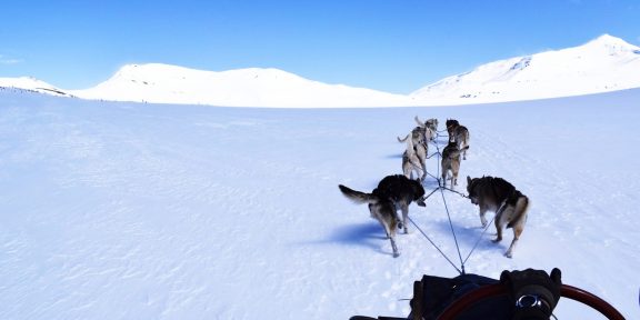 Nevím, jestli jsem nadšenější já nebo oni, ale konečně se jede. Jakmile uvolním sáně a pustím brzdu, smečka v mých saních vyrazí jak blesk, až mám co dělat, abych se udržel. Prvních pár set metru hledám rovnováhu a zkouším zlehka zatáčet. Po chvilce už si ale jen užívám jízdu a kochám se okolní prázdnotou, ze které mě vytrhne jen udávání pokynů mým šesti svěřeným pejskům. Po několika hodinách jízdy přes zasněžené říčky a několik údolí se pomalu otáčíme a vracíme oklikou na začátek trasy.