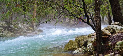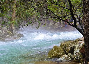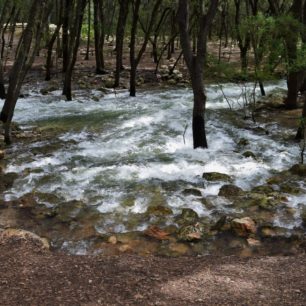 Za mostem se cesta stočila do dubového lesa. Najednou, jako bych se ocitla v magickém prostředí. Na zemi se válely žaludy a rostl mech, který bych na Mallorce neočekávala. Vzduch byl prosycen vlhkostí a možné zvuky ptačího štěbetání přehlušoval zvuk hučící vody. Na mnoha místech kolem cesty vyvěraly malé pramínky vody a tekly lesem ke korytu. Už samotná procházka lesem byla takovým divadlem. Cesta mě dovedla ke kamenému domku, který slouží jako informační centrum a také jsou zde veřejné záchody. Pár metrů od domku stojí kruhová pec na pálené vápno. Lesem za informačním centrem tekla voda. Bylo to zvláštní pozorovat, jak kolem kmenů stromů, které jsou jindy na suchu, takhle teče voda.