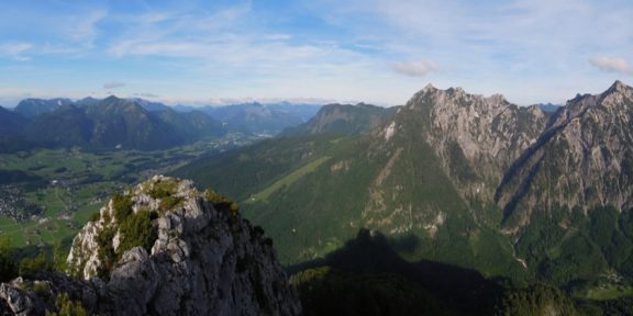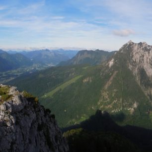 Pohled na hladinu jezera Wolfgangsee je úchvatný! Za jezerem na jeho severním okraji se zvedá Vormauerstein 1450 m, vedle něj snobský Schafberg 1782 m se známou zubačkou, kolem mne vrcholy Bleckwand 1541 m, Rinnkogel 1823 m, Rettenkogel 1780 m, masív Katrin, v dálce na severovýchodě Leonsberg. Jsem z toho výhledu opravdu ohromen!