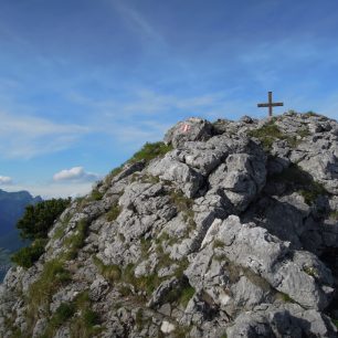 Rozhodně to tady není na škodu. Experimentovat s výstupem na sousední věž asi také není optimální, o čemž svědčí jedna deska s tragickým úmrtím na skále. Poté se dostanu do kleče a po chvilce stojím na malém vršku s vrcholovým křížem. Zcela sám. Nikde ani živáčka. Užívám si vrcholovou siestu.