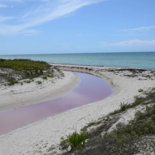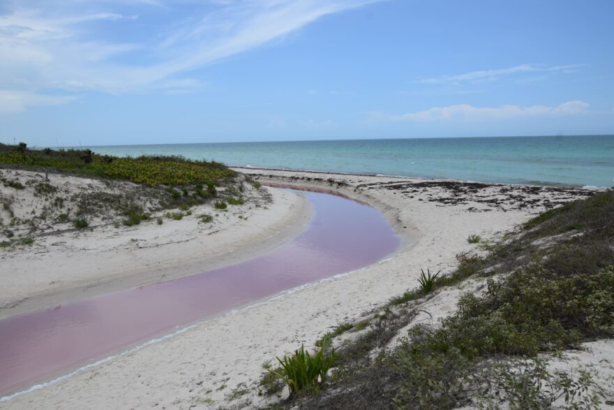 Růžové jezero není unikátní pouze pro svou růžovou barvu, ale i pro jeho obyvatele. Žijí zde plameňáci, krokodýli a spousta dalších zvířat. Rozhodli jsme se však, že do areálu nepůjdeme. Na jezero je pěkný výhled i zpoza plotu, a navíc se podél celé prašné cesty, po níž jsme přijeli, rozkládá úchvatné pobřeží mexického zálivu. Ideální místo pro všechny, kteří mají rádi krásné rozlehlé pláže a soukromí. Voda byla navíc téměř horká, když zašlo sluníčko a my vylezli na břeh, byla nám skoro zima. A mořské vlny zde ukrývají nesčetné množství těch nejhezčích a největších mušlí, jaké jsem kdy v moři viděl.