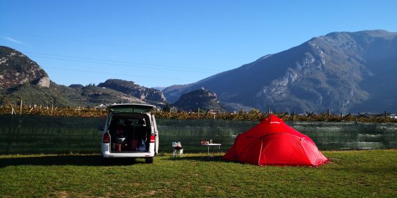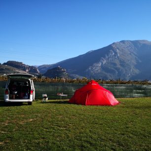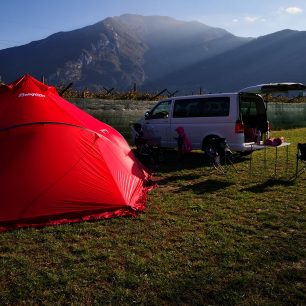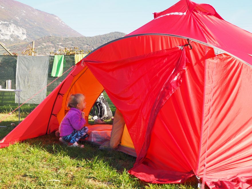 Nicméně náš původní stan nám už ve čtyřech nestačí a v létě testovaný střešní stan Thule jsme museli v srpnu vrátit :-), a tak jsme si na podzimní výjezd k Lago di Garda vypůjčili zase něco trošku jiného: naprosto úžasný červený „velestan“ od firmy Bergans. A přiznávám, že mě model Wiglo uchvátil na první dobrou, a co teprve děti…