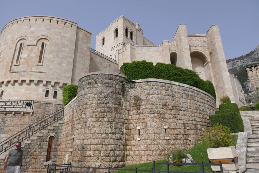 Ale zpět ke Kruji. Hodžův komunistický ansámbl nenechal tento symbol ležet ladem a využil jej skrze svou dceru pro svou propagandu, byť až v době pozdního režimu na počátku osmdesátých let minulého století. Chtěl osvěžit vězeňskou atmosféru, do níž se za jeho vlády Albánie doslova ponořila. A tak na zbytcích zdejšího hradu nechal vybudovat poněkud opulentně výstavný a nehistoricky působící památník největšímu z Albánců – Skanderbegovi, současníkovi našeho krále Jiřího z Poděbrad. Stavba jednoduše do kraje příliš září novotou a do dálky hlásí, že s původním zjevem této pevnosti má vlastně jen pramálo společného. Zároveň však není úplně nezajímavá a navíc ponechává prostor i mnohem původnějším částem hradu se na jeho siluetě podílet. A tak se jeho pevné hradby vinou po stranách hory a občas je přerušují válcové i hranolové věže v různých stadiích půvabných zřícenin.