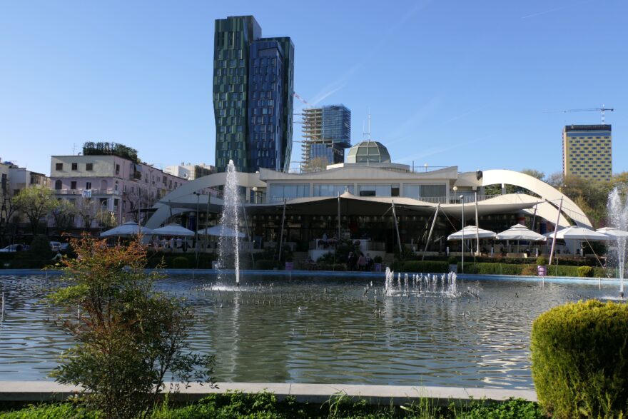 Po této cestě se dostanete až k Zahradě tisíciletí, která vás překvapí svou dokonalou úpravností a bujnou zelení. Část této zahrady porůstá v různobarevných kobercích i okolní zdi, a získává tak vertikální podobu. Všude narážíme na moderní umění, vydlabané obří hlavy s rostlinnými doplňky na vrcholu místo klobouků, podivnou válcovou fontánu padající odshora dolů a mezitím četné stolky kaváren lákajících k posezení a opravená budova kina. I to je současná Tirana, udivující kolemjdoucí, o to více zahraniční turisty, kteří si přečetli, že tato země dosáhla jen na 30 % průměrné životní úrovně dosahované v Evropské unii…