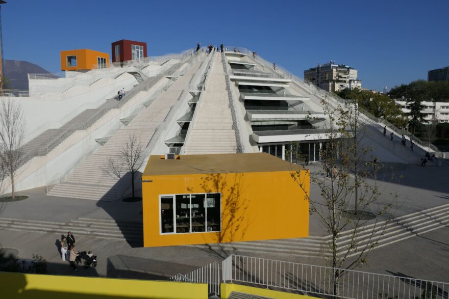 Praha má Hradčany, Vídeň chrám sv. Štěpána a Paříž Eiffelovku. A čím se může pochlubit Tirana? Napadá nás Skleněná pyramida. Myslím, že to není špatná volba. Temné počátky této stavby odkazují jako na svůj důvod vzniku na kult osobnosti albánského vůdce Envera Hodži. Po jeho smrti začala výstavba jeho hrobky po vzoru egyptských faraonů, a to přímo vedle sídla premiéra v menším parku. Brutalistická stavba nemá pravidelnou čtvercovou základnu, nýbrž je to mnohoúhelník, který se sbíhá ve vnitřním kuželovitě zastřešeném prostoru s odhalenými betonovými překlady. Podivný objekt vyrostl na samém sklonku uvadajícího komunistického režimu, který dostal po Hodžově smrti v roce 1985 nemalé trhliny. Místo slavného odhalení jeho ostatků v útrobách obrovské hrobky jeho socha v nadživotní velikosti na Skanderbegově náměstí v roce 1991 padla z piedestalu. Hodžova pyramida bez Hodži náhle osiřela. Co teď s ní? Prázdný skelet tu stál několik desetiletí bez využití. Až se ozvala zdejší univerzita a celek získal nové uplatnění. Stala se z něj otevřená prostora univerzitního kampusu, oživená nevelkými barevnými kvádry dalších přístaveb. Ty jsou jakoby „rozsypány“ v parku kolem pyramidy a různě naskládány na sebe. Obdobou je pak nové řešení interiéru, do něhož byly zabudovány další barevné komponenty podobného vzezření. Pyramida z oceli, betonu a skla znovu ožila! Nejdominantnějším architektonickým prvkem tohoto symbolu se však stalo jeho zpřístupnění řadou schodišť sbíhajících se směrem od základny po plášti budovy až k jeho vrcholu, z něhož je báječný výhled na bující centrum města. Podařená rekonstrukce, která městu přinesla i tolik potřebné interiérové výstavní prostory. Neváhejte a vystoupejte téměř stovku bělostných kamenných schodů až na samotný vrchol s kruhovým výhledem, opravdu to stojí za to!