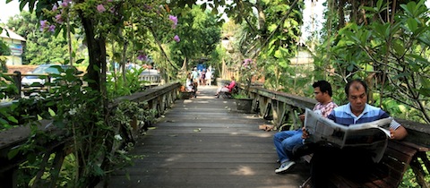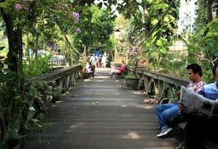 Cestou zpátky, už téměř v centru Ubudu (u silnice směr sever na Penelostan), zastavujeme u kouzelného místa – vysokého železného mostu nad říčkou, po jehož stranách jsou chodníky pro pěší a kolem dokola vysoké stromy s popínavými rostlinami, stylovými, trochu rozpadlými domy a vyhlídkovou restaurací. To vše vytváří přistíněnou, trochu tajemnou pohádkovou atmosféru, kterou si z lavičky náležitě vychutnávám. Procházející prodavač mi nabízí zdobené výrobky z lehkého dřeva, jsou pěkné, ale nemám pro ně využití.