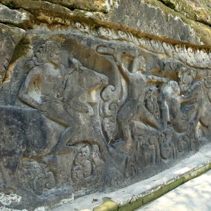 Přejít do galerieU pokladny platíme obligátní vstupné a parkovné, a vydáváme se chodníčkem v údolí lemovaném palmami ke skalní stěně (asi 25 metrů dlouhé), kde jsou vytesané reliéfy z 14ho století. Vidíme sloního boha Ganéšu, jeho syna Šivu, ale pak už jen výjevy z běžného života: muž co nese přes rameno dva džbány (asi s palmovým vínem); našli jsme také loveckou scénu s mužem bojující s nějakou příšerou, zatímco ho vedle napodobuje žába, když zkouší sníst hada. Je to pro nás dřina, vyluštit, co se zde děje.