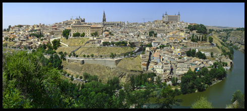 Toledo se rozkládá na kopci asi hodinu cesty na jih od Madridu. Kolem dokola jej obtéká řeka Tajo, která tak tvoří přirozenou hranici, v minulosti zároveň chránící město před útoky nepřátel. Nezaměnitelné a často fotografované toledské panorama lze spatřit již zdálky a blížící se návštěvník si jej nemůže s ničím splést: ze záplavy střech se do výše vypíná gotická katedrála a napravo od ní čtyři věže pevnosti Alcázar.
