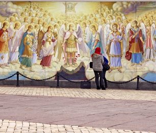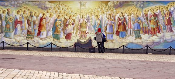 Asi 300 metrů na severovýchod leží další z velkých náměstí, Mykhailivska s dalším neméně monumentálním chrámem Svatého Michala, jenž hledí přes zkratku ulice Volodymyrskaja přímo k průčelí Svaté Sofie. Obří stavba upoutá stejně oslnivě zlatou barvou věží, avšak neobvykle zdobenou modrou fasádou. Zasvěcen byl archandělu Michaelovi na počátku 12. století. Jeho barokní podoba je podobně jako u Zlaté Brány trochu zavádějící, v roce 1936 byl totiž rozprodán a odstřelen sověty. Na místě měly vyrůst monumentální komunistické budovy i památník Lenina, jediné, co zde bylo vybudováno, je vedle stojící monstrózní dobová budova ministerstva zahraničních věcí. Podobně jako zmiňovaná brána byl svatostánek znovu obnoven a otevřen v roce 1999, mnoho času trávíme zíráním na umělecké dílo v podobě malované hraniční zdi.