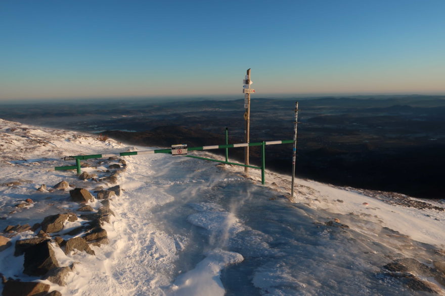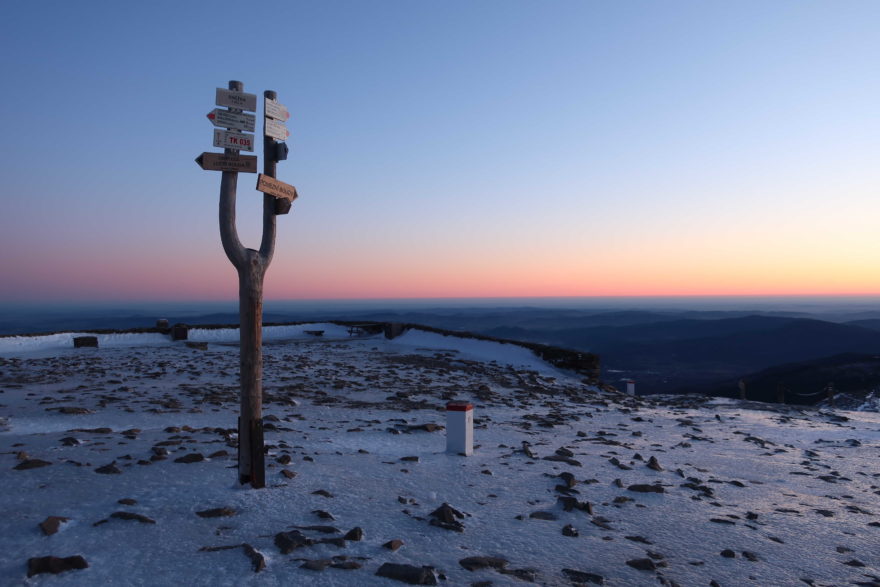 Na následující fotce můžete vidět vrcholový rozcestník a východní obzor minutu před úsvitem, přesně v 5:59.