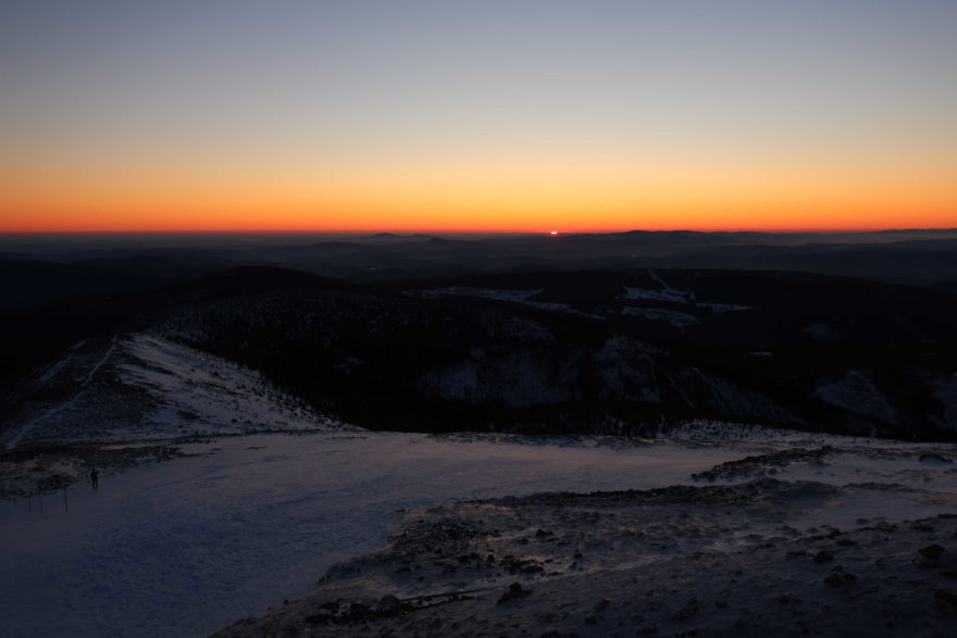 Na různých webových stránkách najdete údaje o tom, kdy ve který den vychází a zapadá Slunce ve vybrané lokalitě. Už tady nastává první nástraha. Tyto údaje jsou čistě geografické, resp. vztažené k zeměpisné šířce a délce a nezohledňují tak členitost terénu. Vzhledem k tomu, že Sněžka vystupuje vysoko nad krajinu, je potřeba čas úsvitu posunout zhruba o 10 minut zpět. Konkrétně na 15. března, kdy jsem na vrchol vyrazil, je čas východu slunce 6:09, nicméně fotku, kterou můžete vidět níže, jsem pořídil v 6:00.