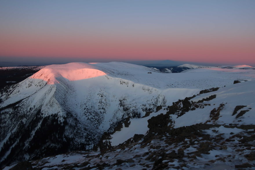 Pohled západním směrem je neméně působivý. Následující fotka byla pořízena v 6:09 a je na ní vidět stín Sněžky a západní Krkonoše, které jsou stále v občanském rozbřesku.