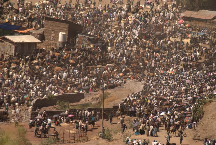 Pohled na davy na zvířecím trhu shromážděné u Lalibely