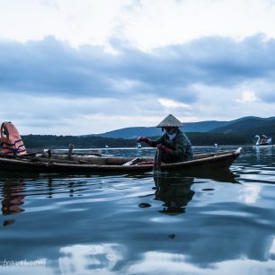 Po dvou dnech sbírání krajinek a toulání se po kopečcích a náhorních plošinách měním scenérii a po dní jízdy překonám sto padesát kilometrů a se západ slunce vyhlížím nad mořskou zátočinou nedaleko Nha Trang. Do města se nechystám, jeho komerční pověst sahá na stovky kilometrů daleko a já bych se rád vyhnul davům. Bílé písčité pláže mě zas tak úplně nelákají, nejsem až tak zcela plážový typ a noc trávím na neutrální půdě na okraji města a po sprše se ještě narychlo vracím ven, udělat něco fotografií a vetřít se do podvečerního života místních rybářů