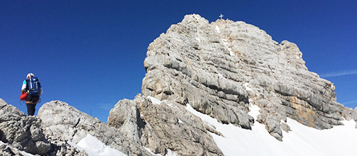 Druhý den pokračujte přes ledovec Hallsttäter Gletscher k ferratě Randkluftsteig, která vede k vrcholovému kříži. Ferrata je klasifikována jako B, pravděpodobně by se dala zvládnout i bez jištění, ale vzhledem k možnosti front, čekání a vyhýbání se, se raději jistěte.