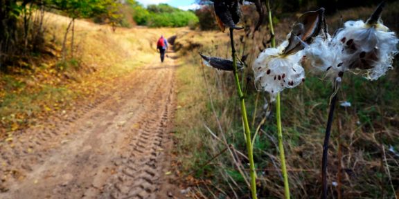 Po několika stech metrech začíná cesta mírně stoupat, je písčitá a naše nohy se do písku boří. Projdeme rozlehlé stepní louky, plné různých travin, bodláků i keřů, až k okraji lesního porostu. Mírným stoupáním se po jeho pravé straně dostáváme na mírně zvlněnou náhorní planinu s širokými výhledy do okolí. Širší cesta, zatáčející mírně vpravo nás vede kolem hustých trnkových keřů přes planinu, až k okraji hluboké stepní rokle.