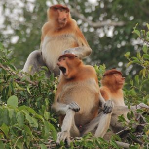 Asi 20 minut od Pangkalan Bun sjíždíme k deltě řeky u obce Kumai a nasedáme do dřevěných obytných lodí zvaných klotoky. Kapitán si to míří přes širokou hnědou tepnu zdejšího života, potom vklouzne do jejího levého přítoku, řeky Sekonyer, a pomalu a tiše se plavíme meandry podél břehů lemovaných palmami až k posledním osadám. Tady se řeka dělí na dvě říčky a levý přítok se vnoří do národního parku. Plujeme pod klenbou tropické džungle a na stromech okolo nás poskakují kahau nosatí. Těší se, až loď odežene jejich nepřátele a oni budou moci bezpečně přeplavat na druhý břeh.