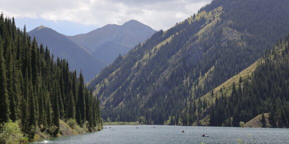 Ráno nám brzké vstávání příliš nepomůže, protože jezdíme po Almaty a nemůžeme se dostat na výjezd k našemu cíli – Boľšomu Almatinskomu ozeru. Nakonec ale stojíme v přeplněném autobuse LAZ, který s námi funivě šplhá do horského podhůří. Když i jemu dojde dech, začínáme pracovat my. Zatím to je dobré – silnice se krásně vine podhůřím a když dosáhneme jezera, začíná první pozdrav hor – liják. Naštěstí se počasí brzy umoudřilo a můžeme nastoupit tam, kde již žádné autobusy nejezdí. První tábor rozkládáme na břehu říčky Ozyorné, kterou je nám druhý den souzeno překonat.