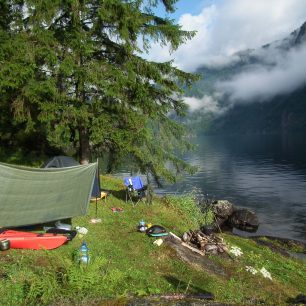 Ráno jsme se probudili netradičně do deštivého dne. Asi jsme ho tou plachtou přivolali. Oheň ze suchého dřeva, které jsme si večer prozřetelně připravili, máme za chvilku. Prší drobně, ale je silně zataženo. Míra je mistr kuchař a vaření si opravdu užíváme. Snídaně a večeře, to jsou hody z domácích zásob. Z místních zdrojů máme houby, borůvky, maliny a jahody. Praktikujeme polopenzi. Oběd, to by byla ztráta času.